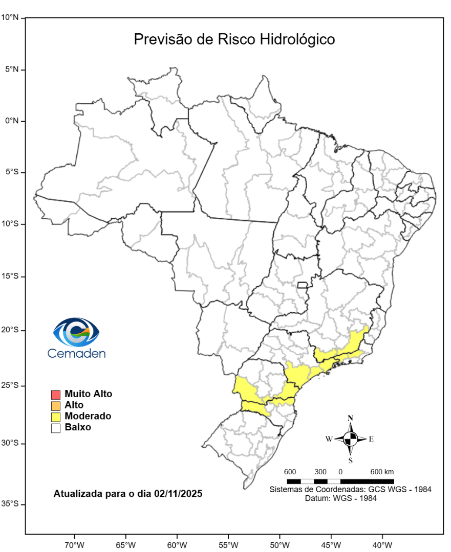 Figura 1 - Possibilidade de ocorrência de eventos hidrológicos em ao menos um município das mesorregiões indicadas. Este mapa é elaborado por uma equipe multidisciplinar, levando em consideração os cenários de riscos hidrológicos atuais somados à previsão de chuva.