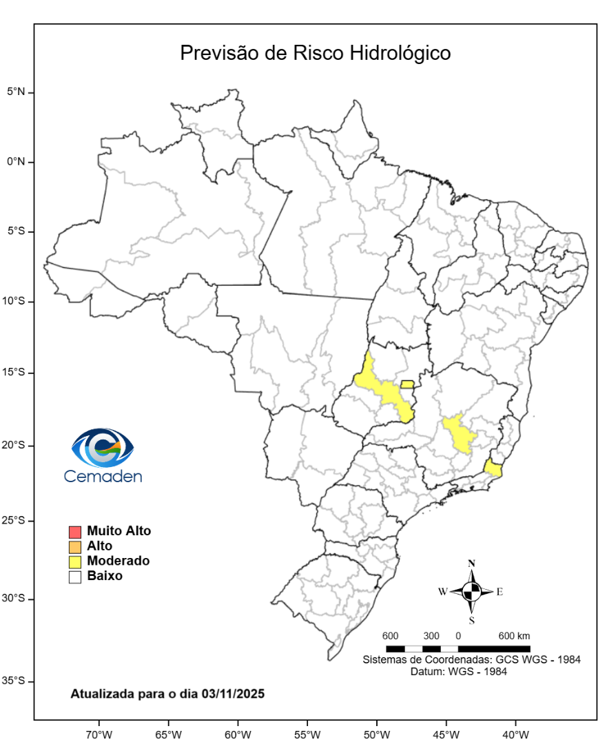 Figura 1 - Possibilidade de ocorrência de eventos hidrológicos em ao menos um município das Regiões Geográficas Intermediárias indicadas. Este mapa é elaborado por uma equipe multidisciplinar, levando em consideração os cenários de riscos hidrológicos atuais somados à previsão de chuva.