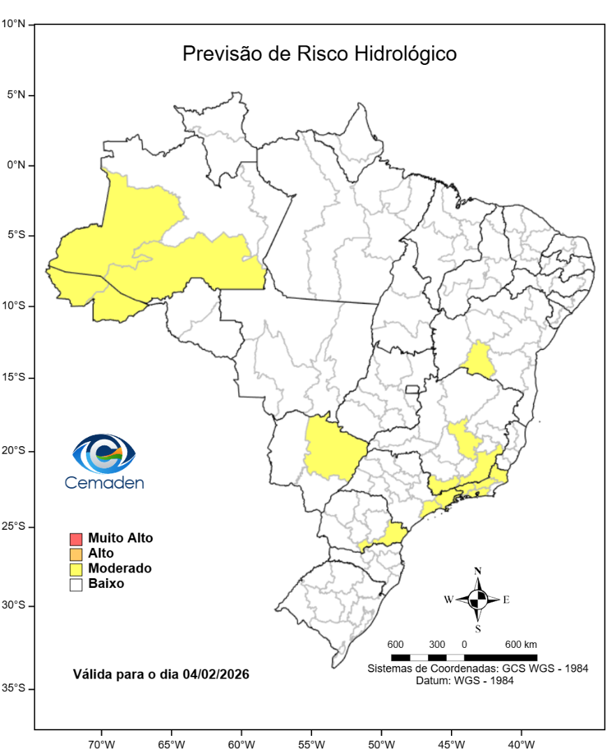 Nesta quarta-feira (04/02/2026), o cenário de risco de eventos geo-hidrológicos para as regiões do Brasil é apresentado a seguir: