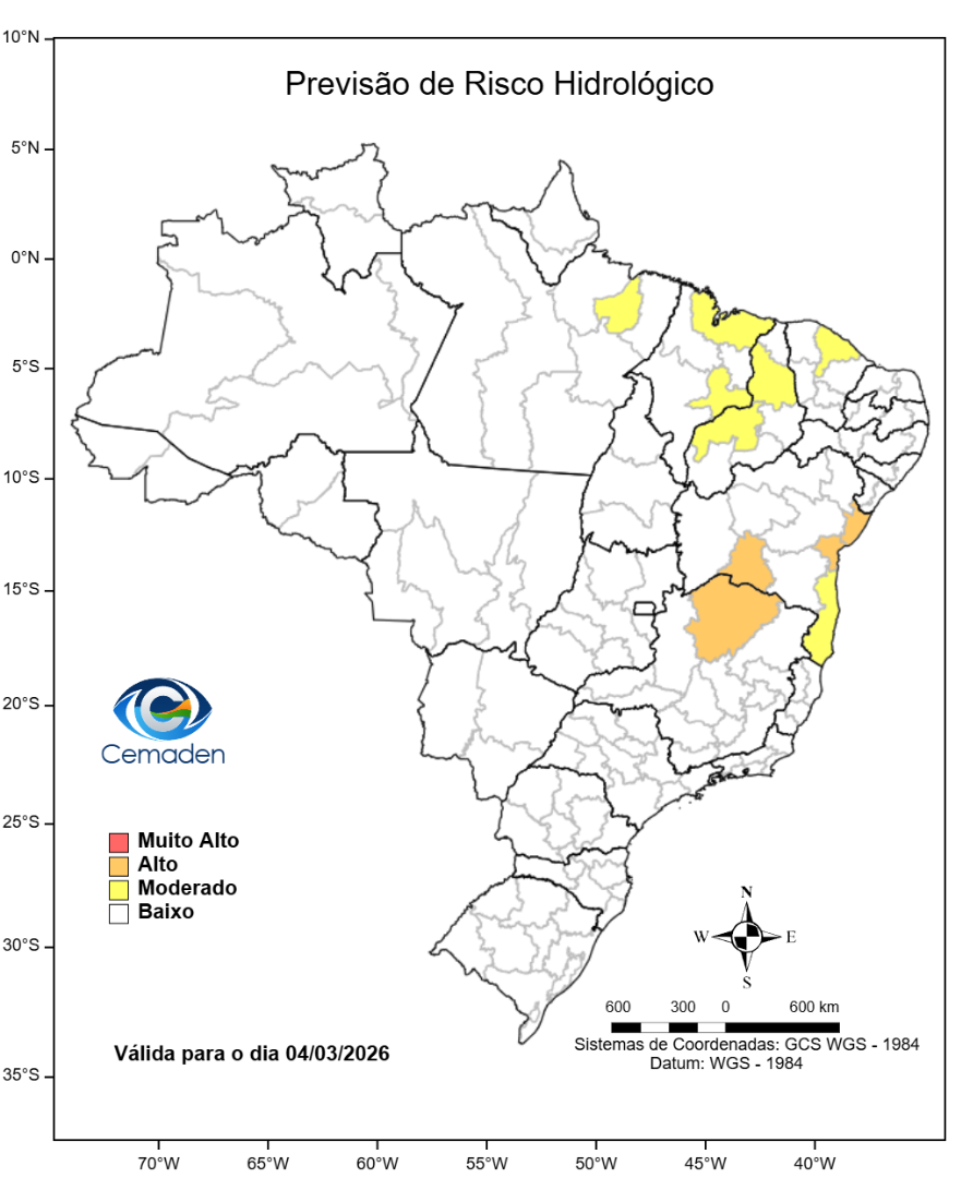 Nesta quarta-feira (04/03/2026), o cenário de risco de eventos geo-hidrológicos para as regiões do Brasil é apresentado a seguir: