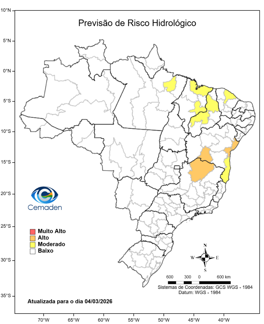 Nesta quarta-feira (04/03/2026), o cenário de risco de eventos geo-hidrológicos para as regiões do Brasil é apresentado a seguir: