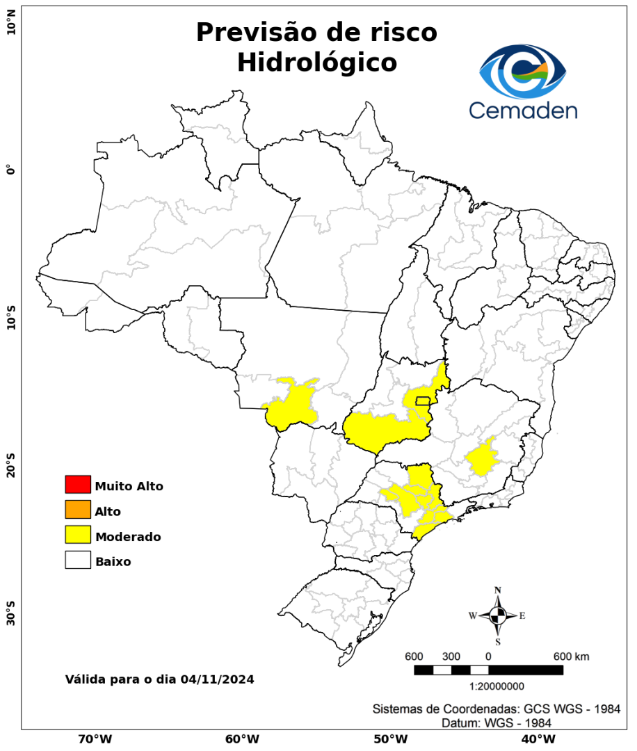 Nesta segunda-feira (04/11/2024), o cenário de risco de eventos geo-hidrológicos para as mesorregiões do Brasil é apresentado a seguir: