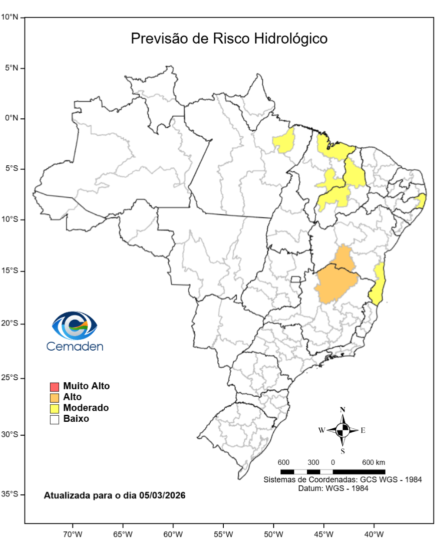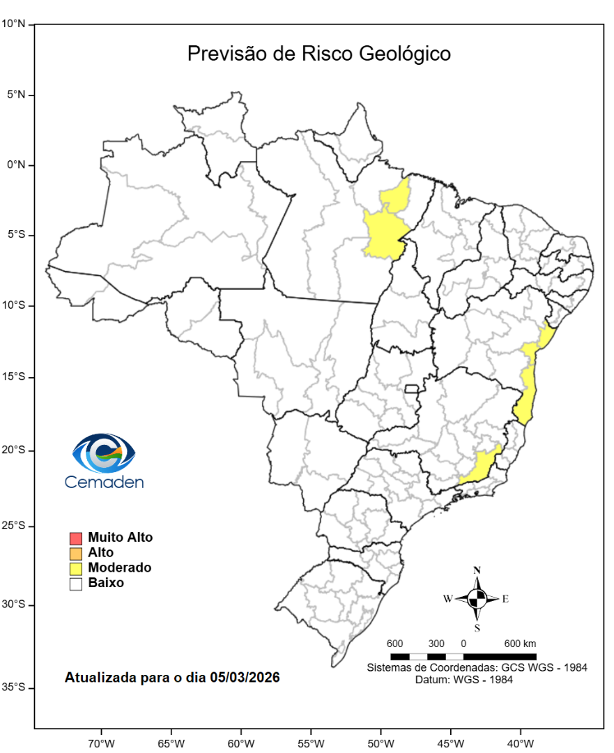 Nesta quinta-feira (05/03/2026), o cenário de risco de eventos geo-hidrológicos para as regiões do Brasil é apresentado a seguir: