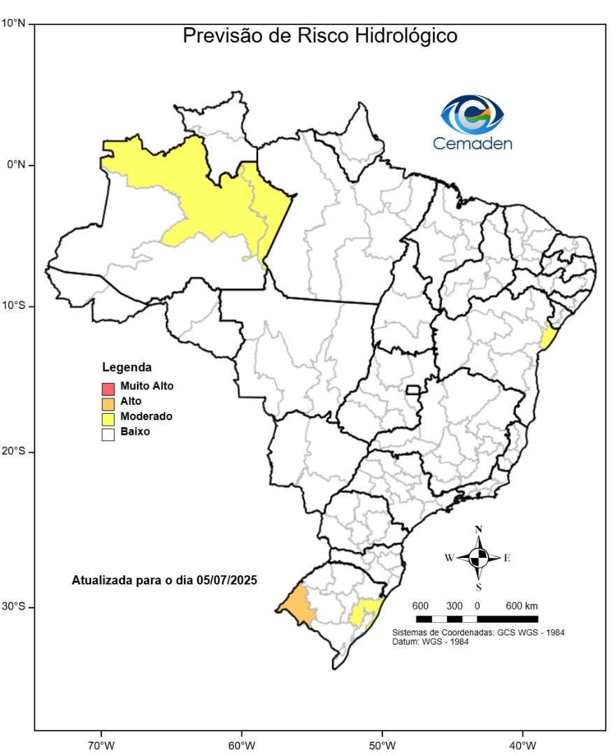 Figura 1 - Possibilidade de ocorrência de eventos hidrológicos em ao menos um município das Regiões Geográficas Intermediárias indicadas. Este mapa é elaborado por uma equipe multidisciplinar, levando em consideração os cenários de riscos hidrológicos atuais somados à previsão de chuva.