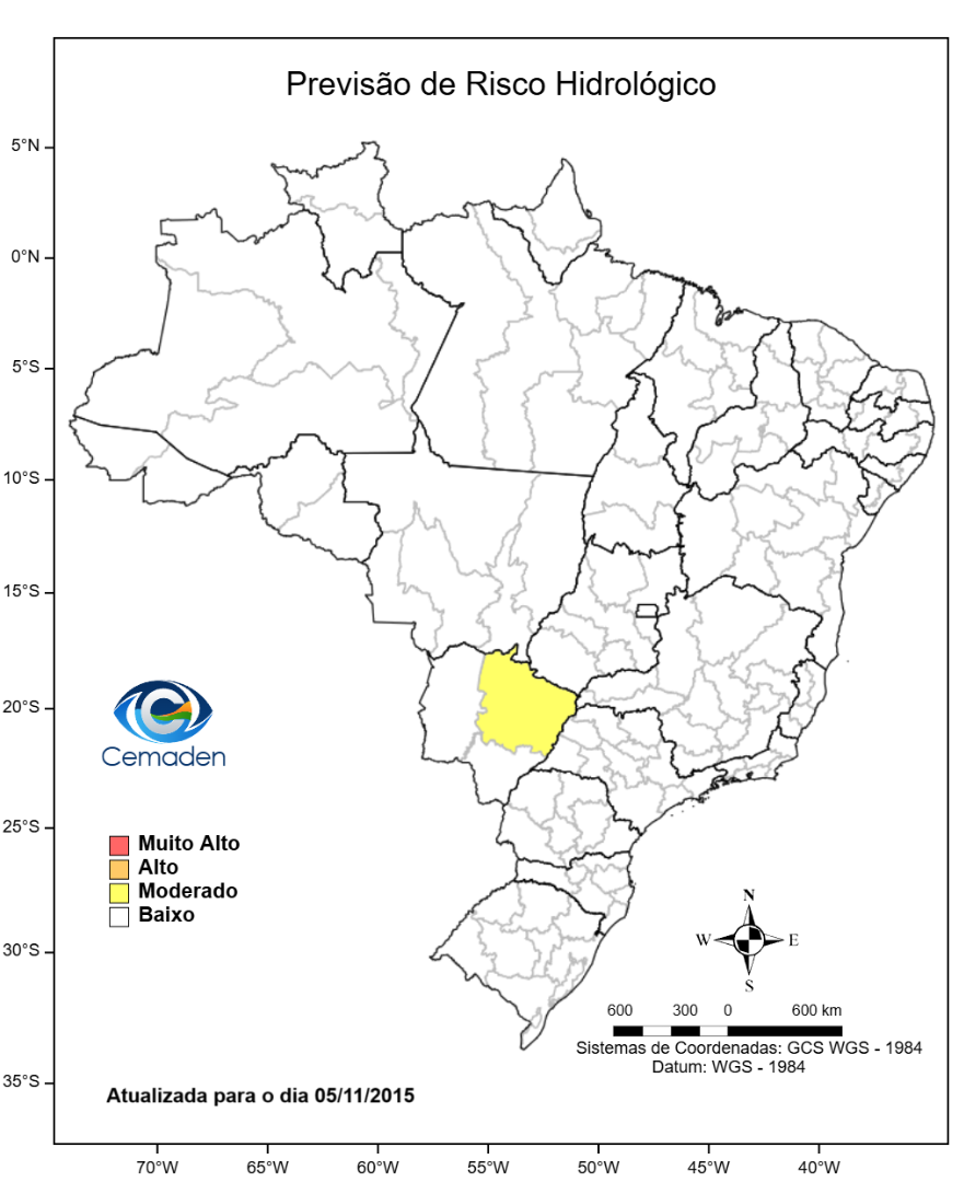 Figura 1 - Possibilidade de ocorrência de eventos hidrológicos em ao menos um município das Regiões Geográficas Intermediárias indicadas. Este mapa é elaborado por uma equipe multidisciplinar, levando em consideração os cenários de riscos hidrológicos atuais somados à previsão de chuva.