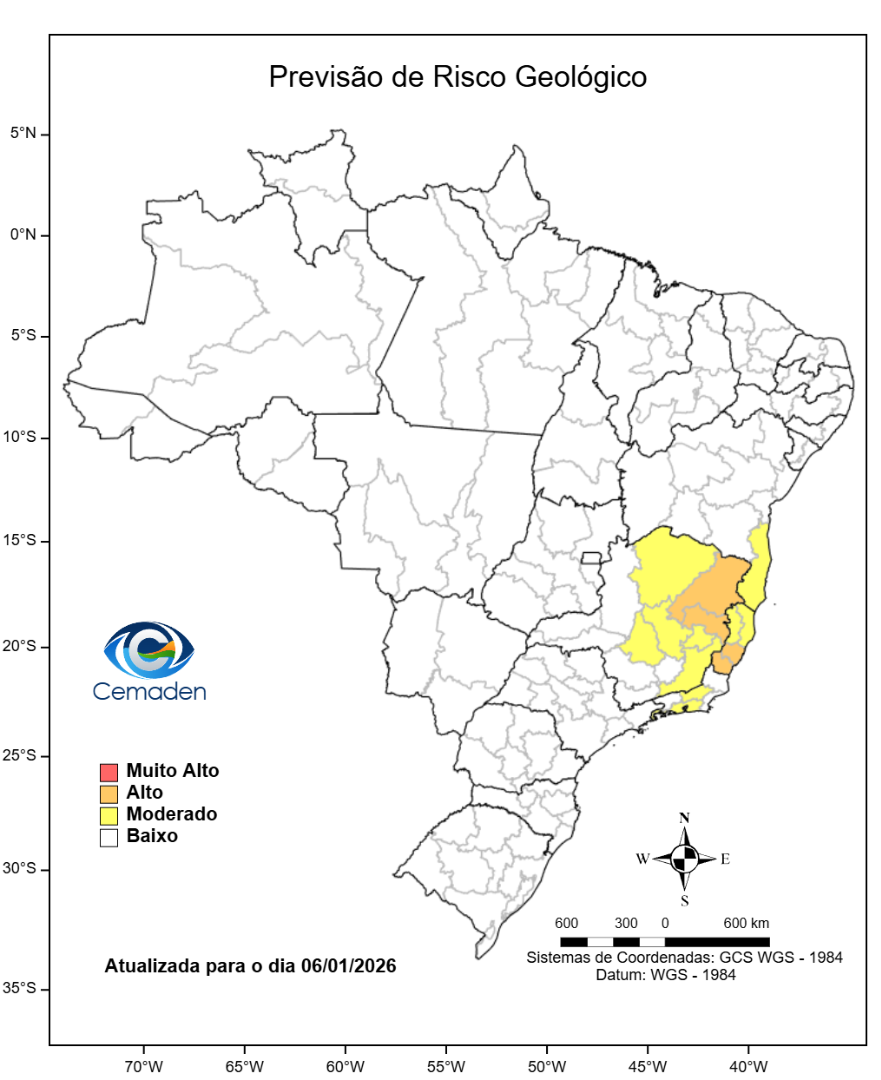 Nesta terça-feira (06/01/2026), o cenário de risco de eventos geo-hidrológicos para as regiões do Brasil é apresentado a seguir: