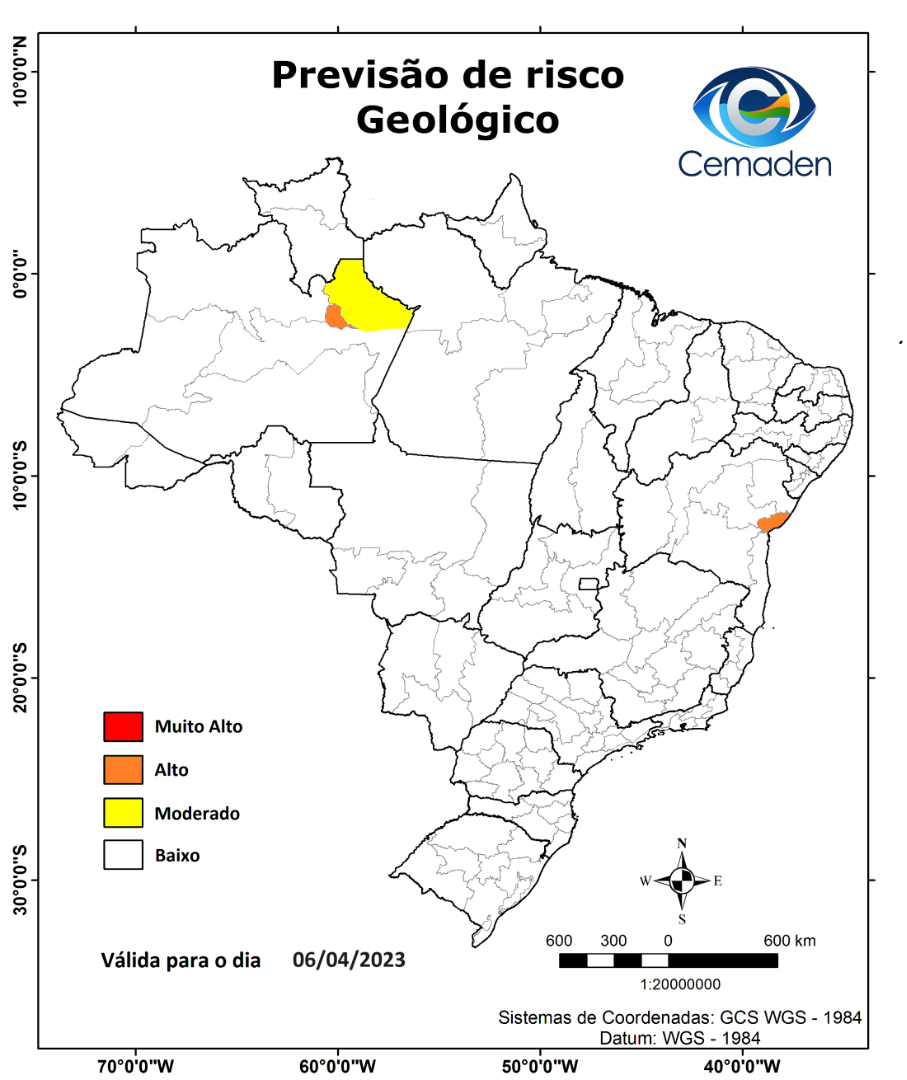 Neste sábado (06/04/2024), o cenário de risco de eventos geo-hidrológicos para as mesorregiões do Brasil é apresentado a seguir: