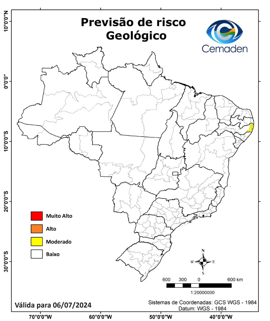 Neste sábado, (06/07/2024), o cenário de risco de eventos geo-hidrológicos para as mesorregiões do Brasil é apresentado a seguir: