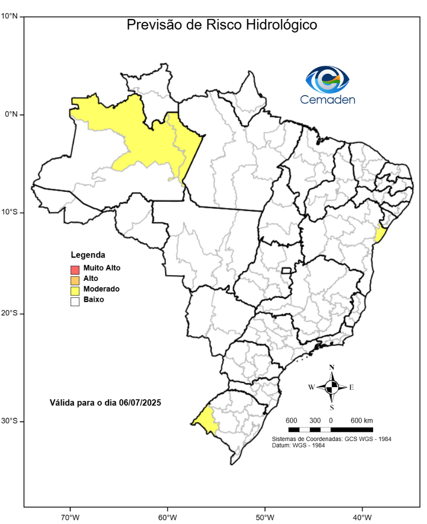 Neste domingo (06/07/2025), o cenário de risco de eventos geo-hidrológicos para as regiões do Brasil é apresentado a seguir: