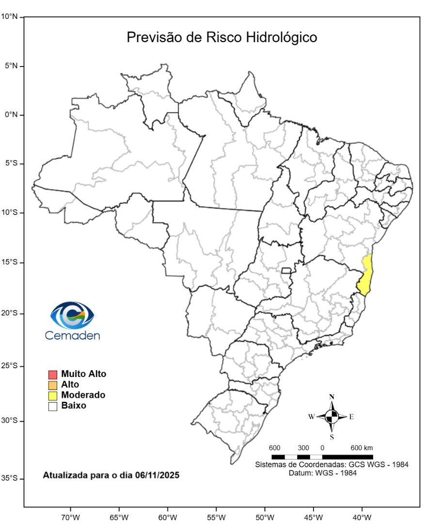 Nesta quinta-feira (06/11/2025), o cenário de risco de eventos geo-hidrológicos para as regiões do Brasil é apresentado a seguir: