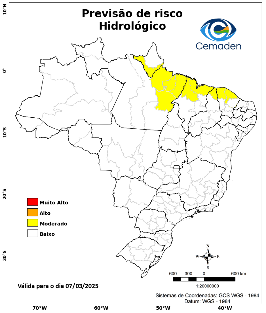 Nesta sexta-feira (07/03/2025), o cenário de risco de eventos geo-hidrológicos para as regiões do Brasil é apresentado a seguir:
