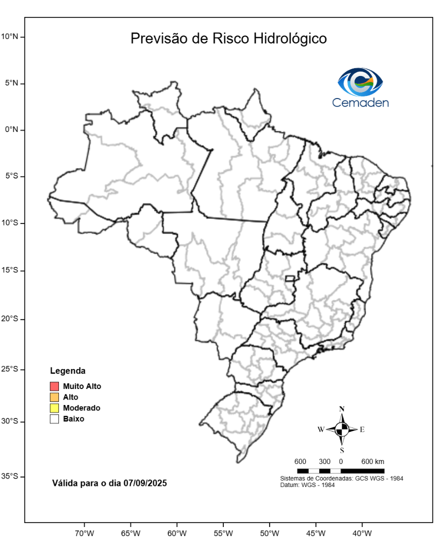 Figura 1 - Possibilidade de ocorrência de eventos hidrológicos em ao menos um município das Regiões Geográficas Intermediárias indicadas. Este mapa é elaborado por uma equipe multidisciplinar, levando em consideração os cenários de riscos hidrológicos atuais somados à previsão de chuva.