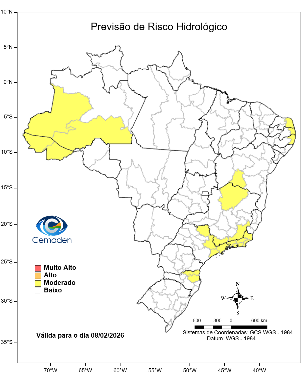 Neste domingo (08/02/2026), o cenário de risco de eventos geo-hidrológicos para as regiões do Brasil é apresentado a seguir: