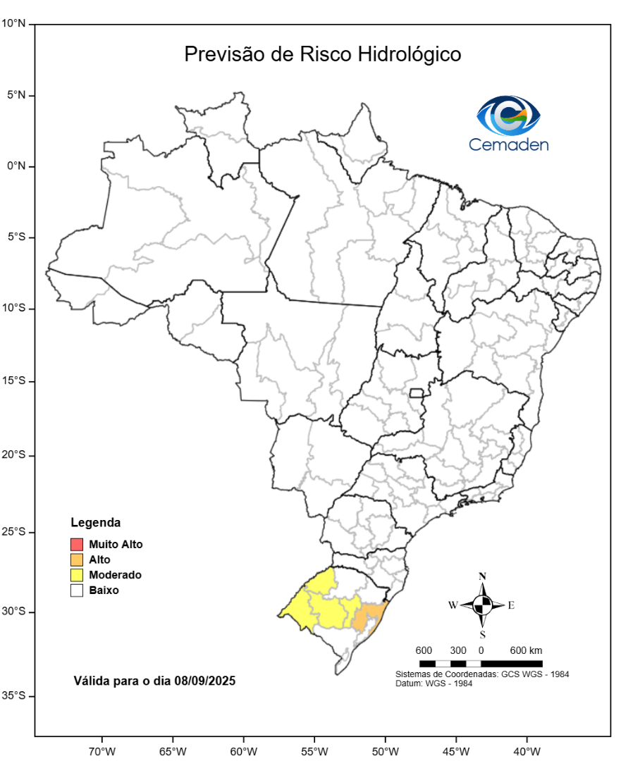 Figura 1 - Possibilidade de ocorrência de eventos hidrológicos em ao menos um município das Regiões Geográficas Intermediárias indicadas. Este mapa é elaborado por uma equipe multidisciplinar, levando em consideração os cenários de riscos hidrológicos atuais somados à previsão de chuva.