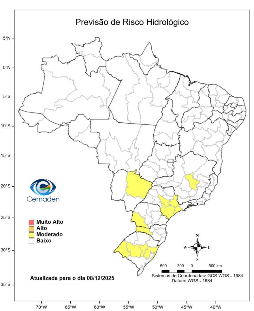 Nesta segunda-feira (08/12/2025), o cenário de risco de eventos geo-hidrológicos para as regiões do Brasil é apresentado a seguir: