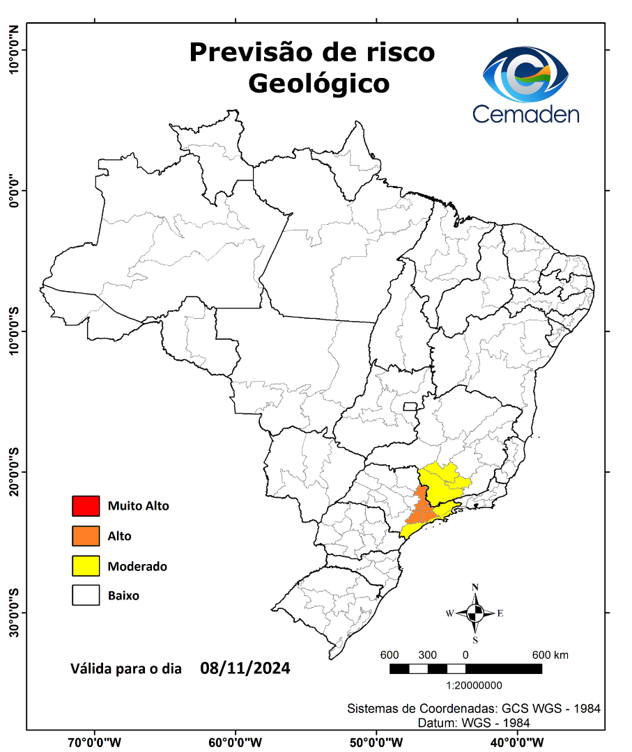 Nesta sexta-feira (08/11/2024), o cenário de risco de eventos geo-hidrológicos para as mesorregiões do Brasil é apresentado a seguir: