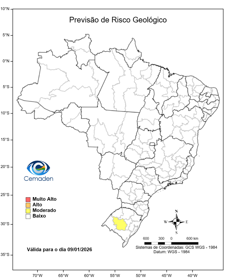 Nesta sexta-feira (09/01/2026), o cenário de risco de eventos geo-hidrológicos para as regiões do Brasil é apresentado a seguir: