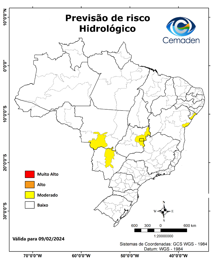 Nesta sexta-feira (09/02/2024), o cenário de risco de eventos geo-hidrológicos para as mesorregiões do Brasil é apresentado a seguir: