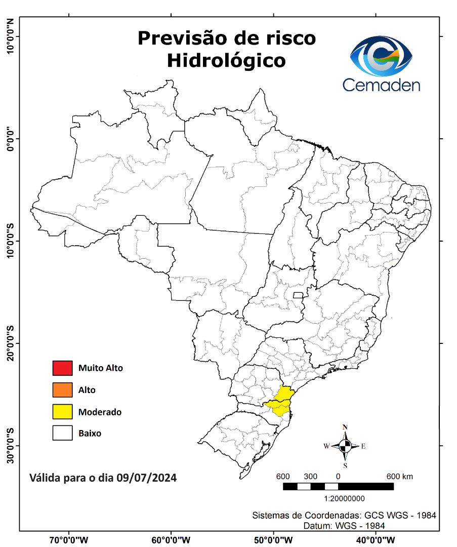 Nesta terça-feira, (09/07/2024), o cenário de risco de eventos geo-hidrológicos para as mesorregiões do Brasil é apresentado a seguir: