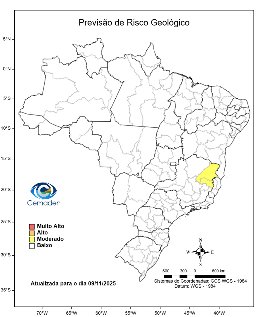 Figura 2 - Probabilidade de ocorrência de deslizamentos de terra em ao menos um município das Regiões Geográficas Intermediárias (e/ou subdivisões regionais) indicadas. Este mapa é elaborado por uma equipe multidisciplinar, levando em consideração as condições dos cenários de riscos geológicos atuais somados à previsão de chuva.