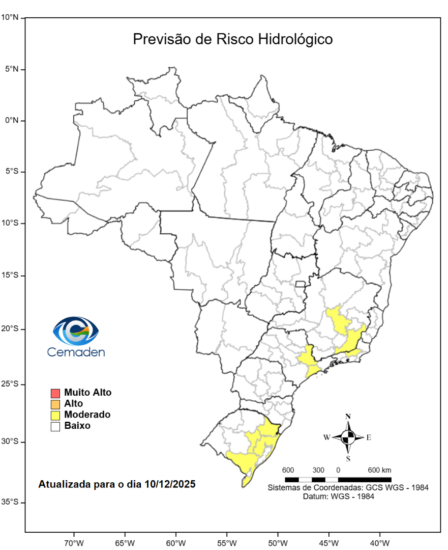 Nesta quarta-feira (10/12/2025), o cenário de risco de eventos geo-hidrológicos para as regiões do Brasil é apresentado a seguir: