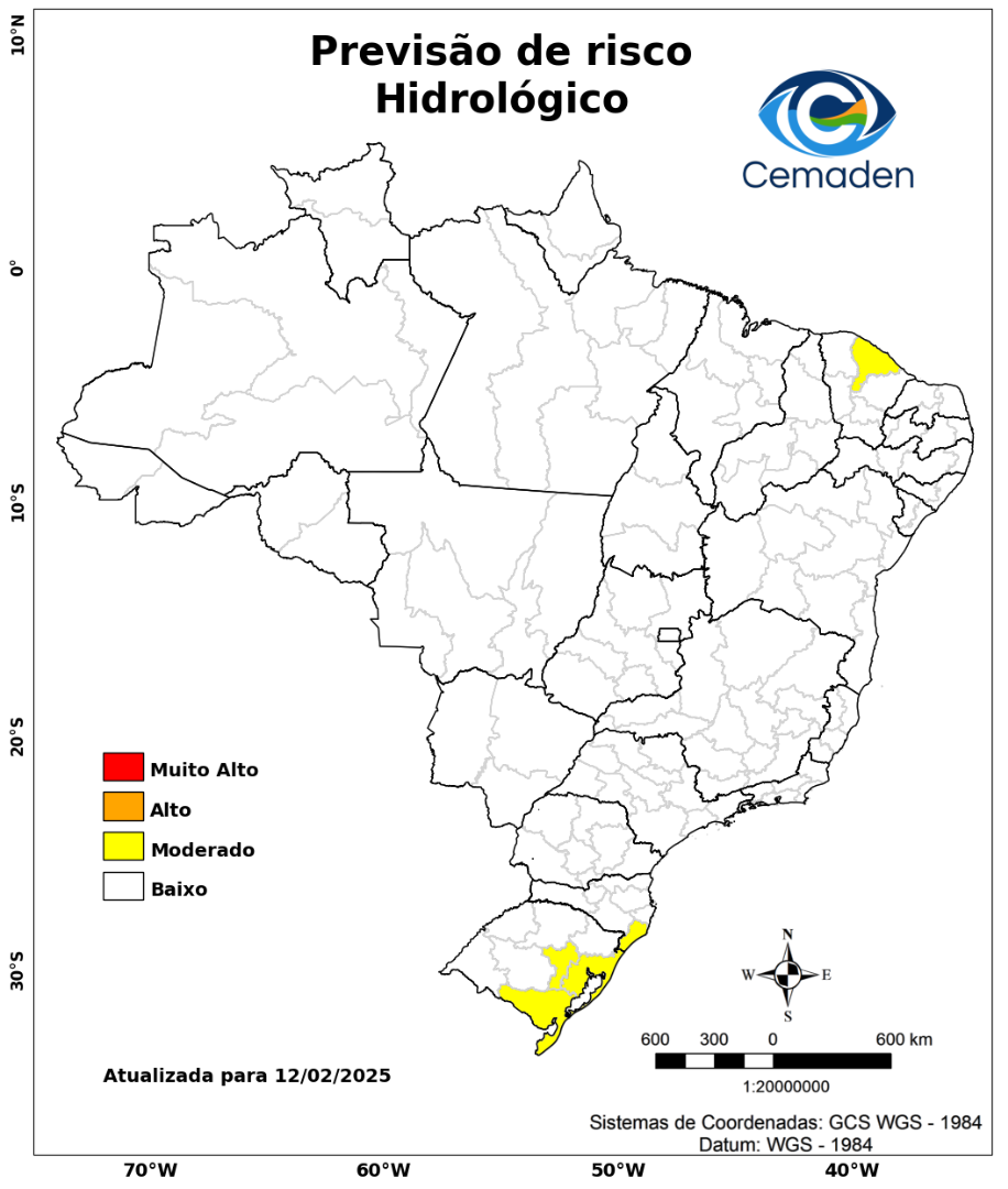 Nesta quarta-feira (12/02/2025), o cenário de risco de eventos geo-hidrológicos para as regiões do Brasil é apresentado a seguir: