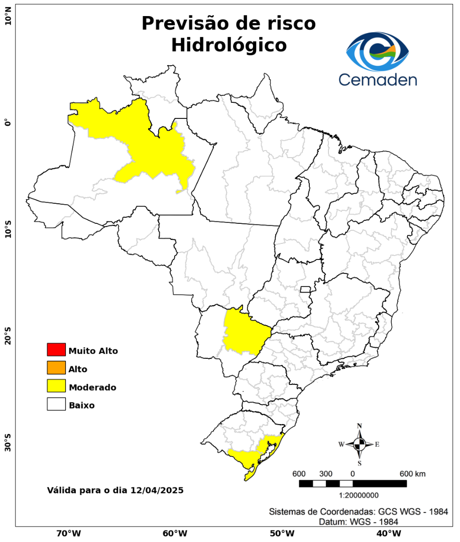 Neste sábado (12/04/2025), o cenário de risco de eventos geo-hidrológicos para as regiões do Brasil é apresentado a seguir: