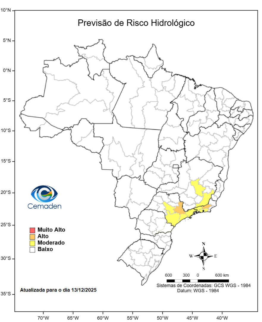 Neste sábado (13/12/2025), o cenário de risco de eventos geo-hidrológicos para as regiões do Brasil é apresentado a seguir: