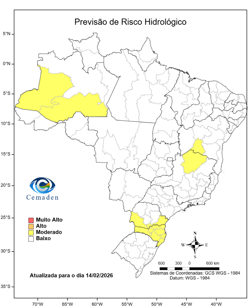Neste sábado (14/02/2026), o cenário de risco de eventos geo-hidrológicos para as regiões do Brasil é apresentado a seguir: