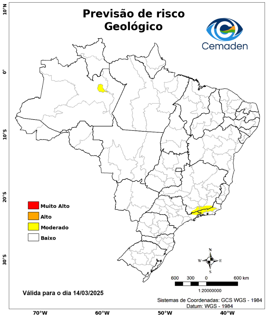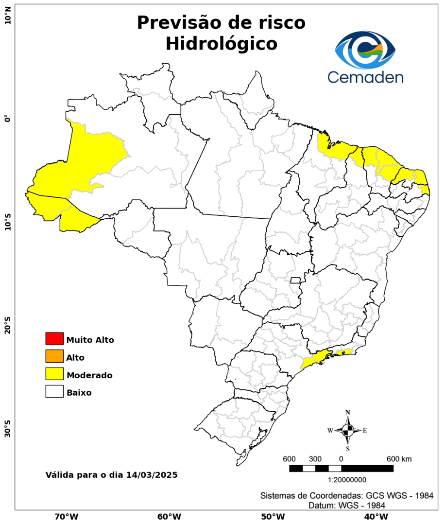 Nesta sexta-feira (14/03/2025), o cenário de risco de eventos geo-hidrológicos para as regiões do Brasil é apresentado a seguir: