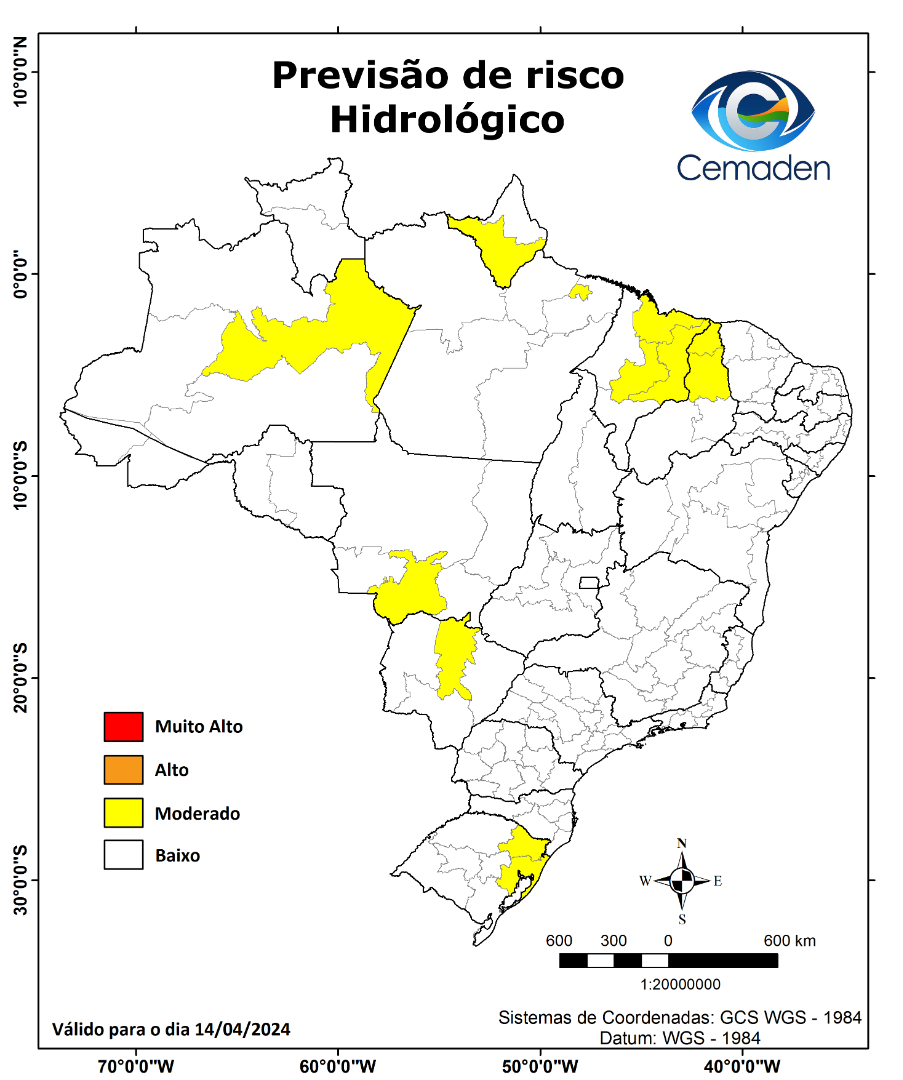 Neste domingo (14/04/2024), o cenário de risco de eventos geo-hidrológicos para as mesorregiões do Brasil é apresentado a seguir: