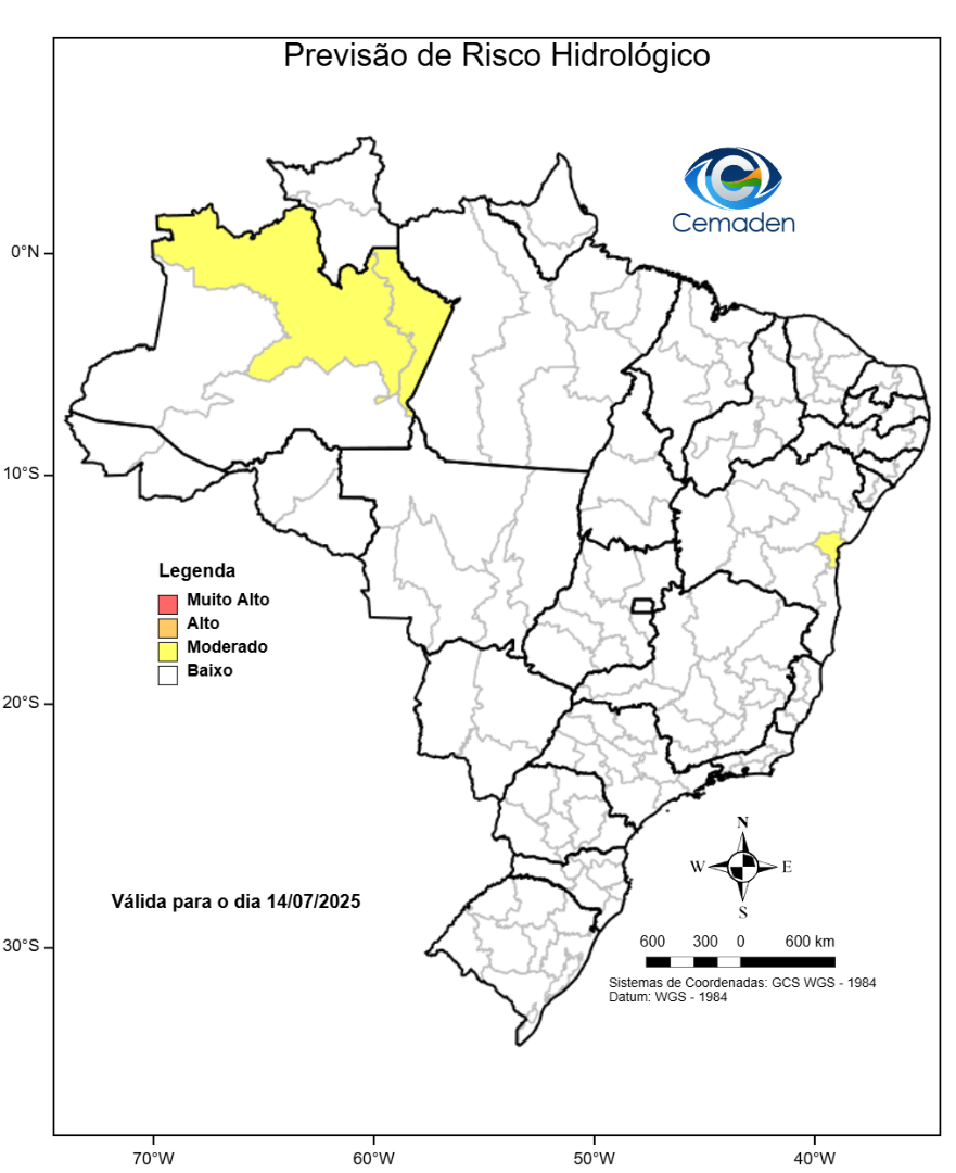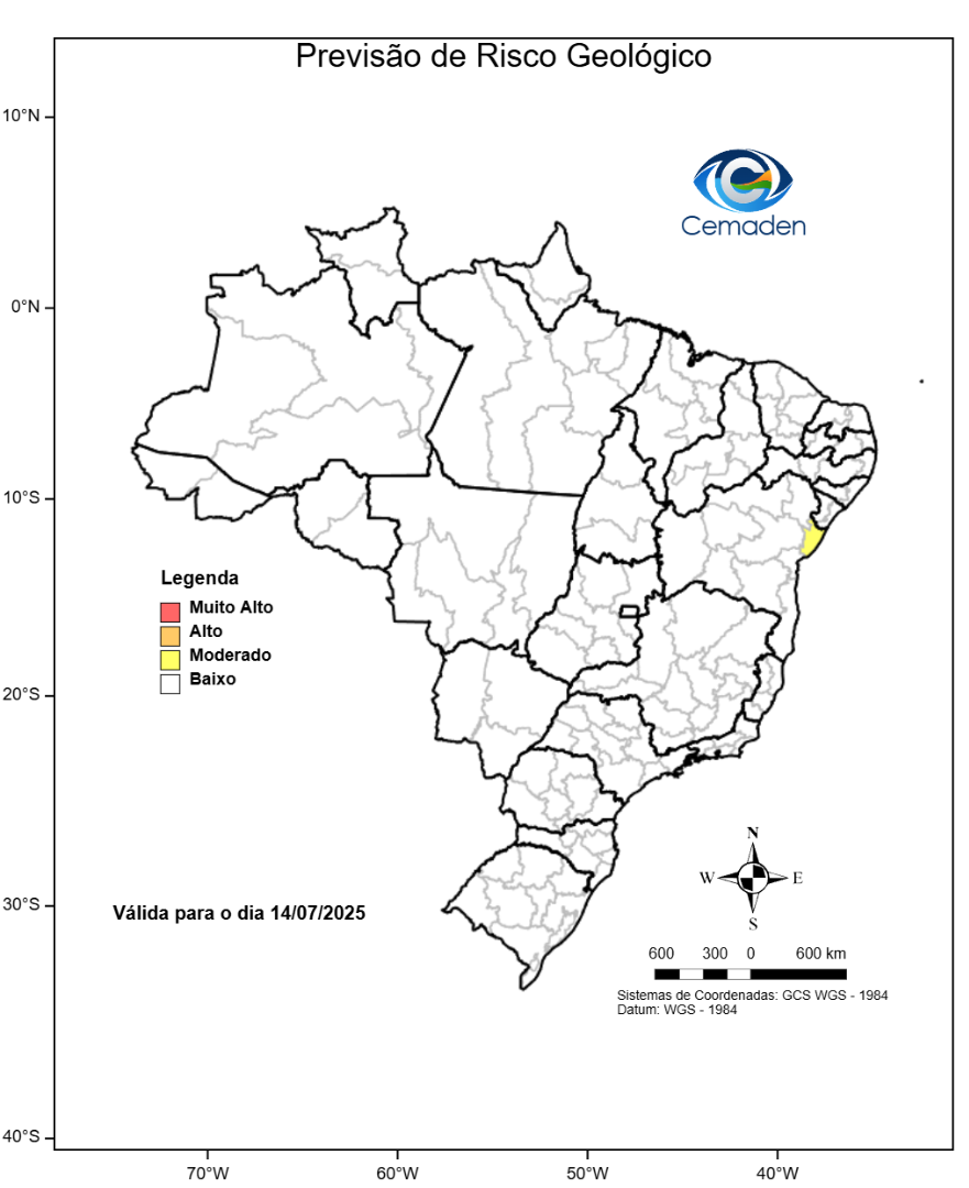 Nesta segunda-feira (14/07/2025), o cenário de risco de eventos geo-hidrológicos para as regiões do Brasil é apresentado a seguir: