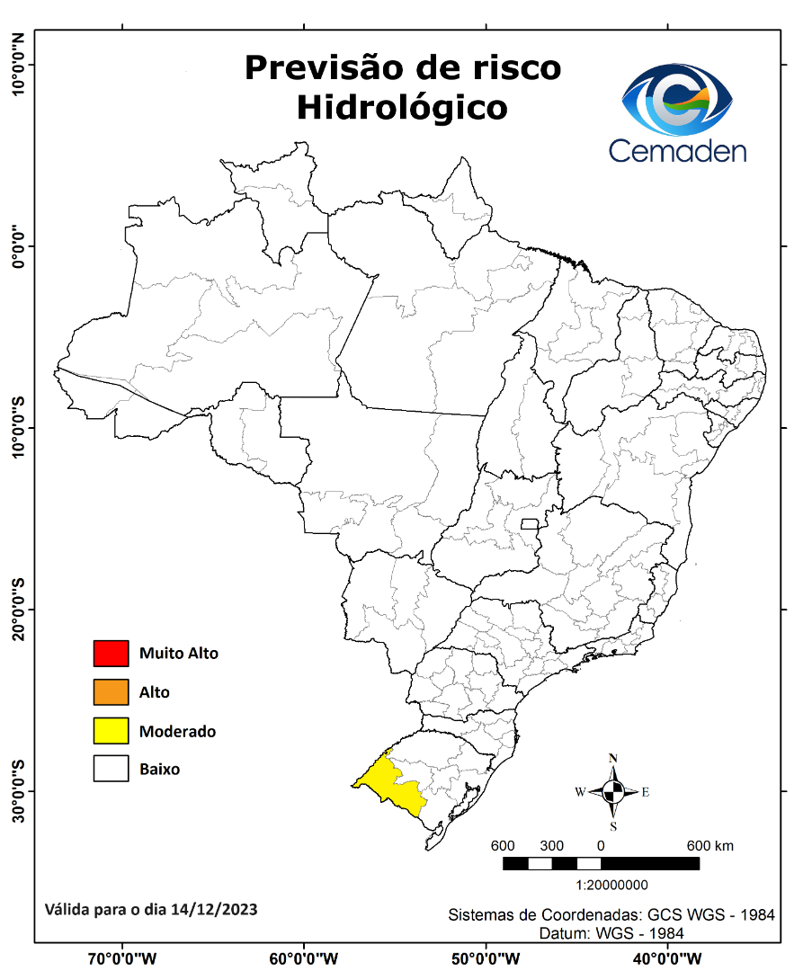 Nesta quinta-feira (14/12/2023), o cenário de risco de eventos geo-hidrológicos para as mesorregiões do Brasil é apresentado a seguir:
