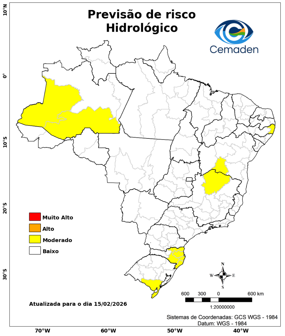 Neste domingo (15/02/2026), o cenário de risco de eventos geo-hidrológicos para as regiões do Brasil é apresentado a seguir: