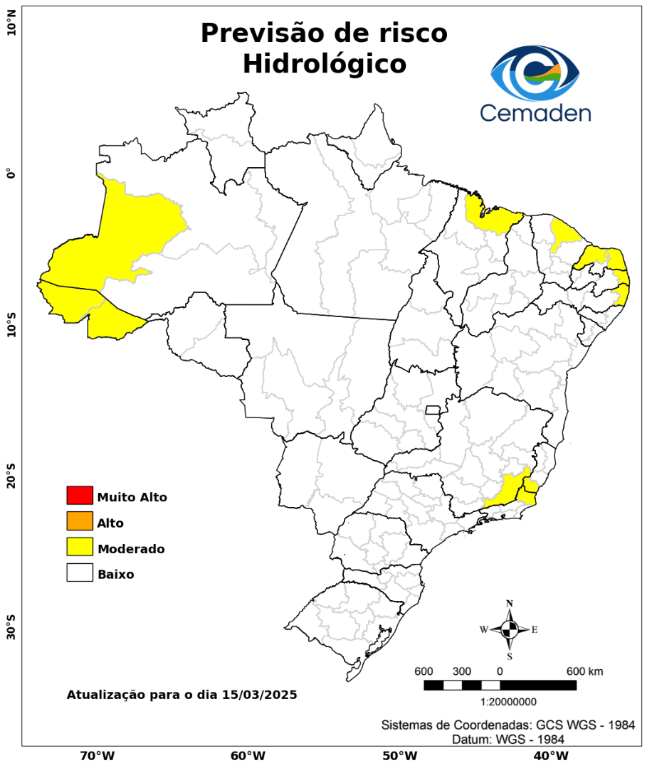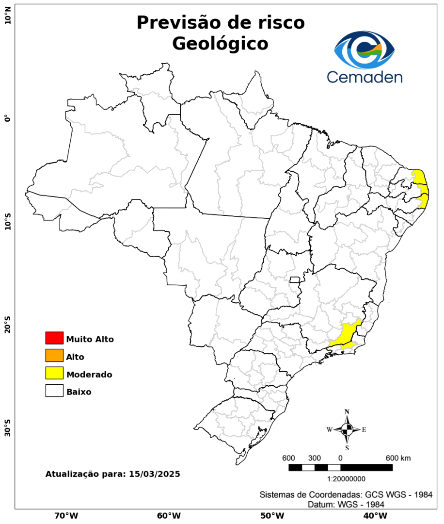 Neste sábado (15/03/2025), o cenário de risco de eventos geo-hidrológicos para as regiões do Brasil é apresentado a seguir: