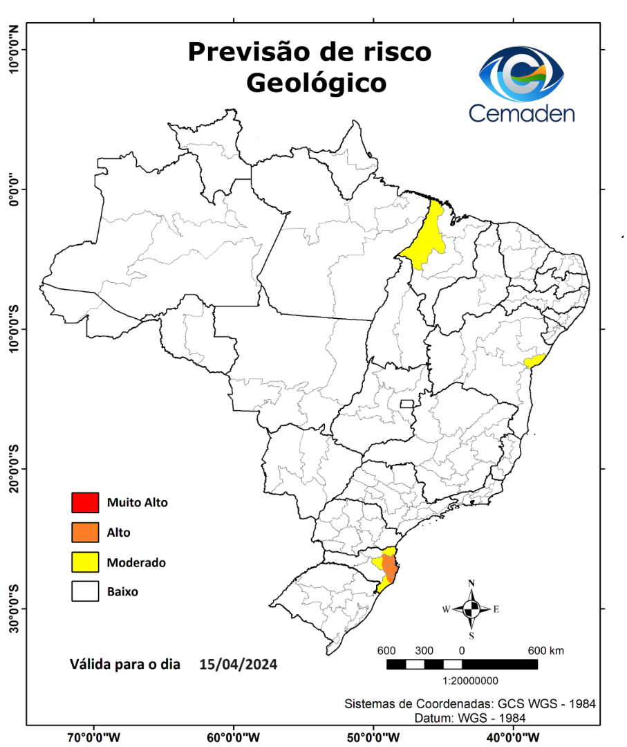 Nesta segunda-feira (15/04/2024), o cenário de risco de eventos geo-hidrológicos para as mesorregiões do Brasil é apresentado a seguir: