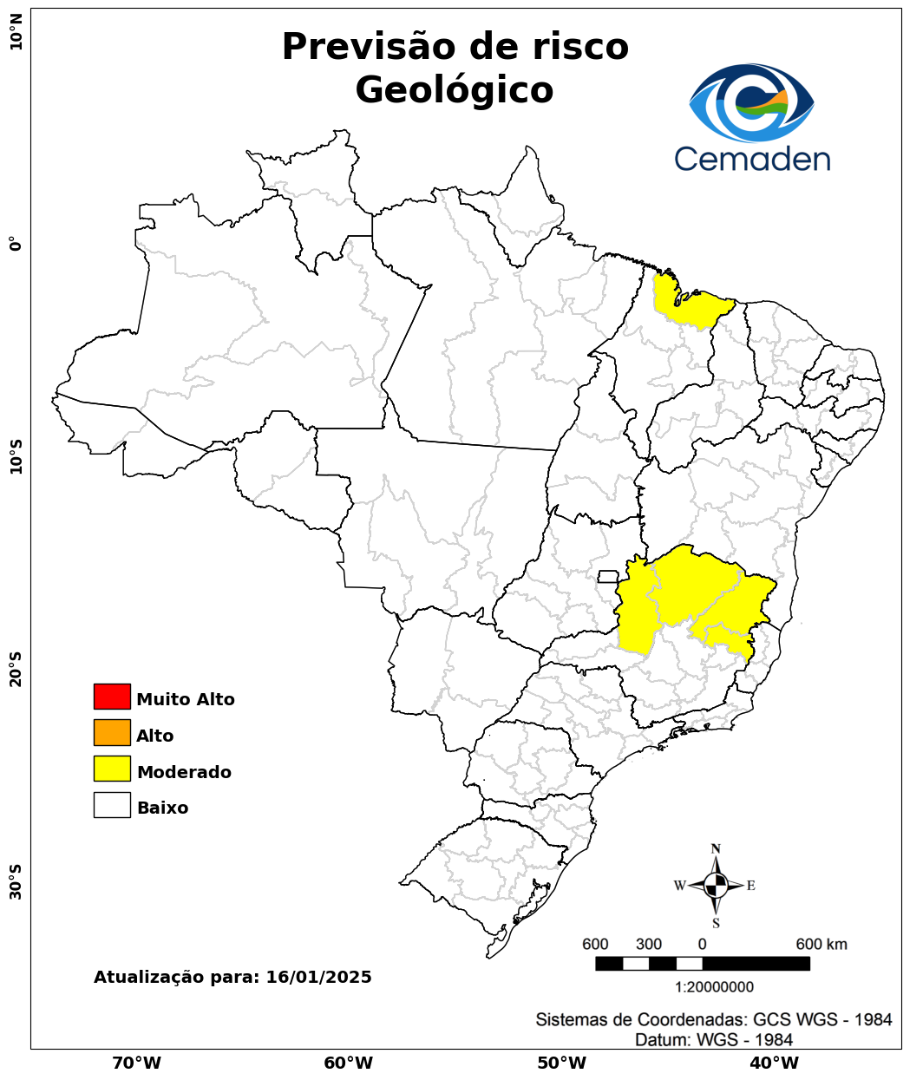 Nesta quinta-feira (16/01/2025), o cenário de risco de eventos geo-hidrológicos para as mesorregiões do Brasil é apresentado a seguir: