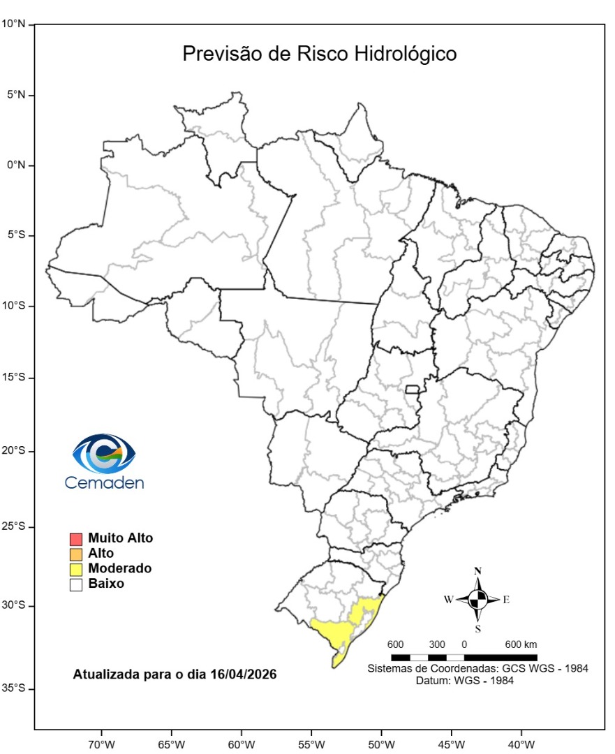 Nesta quinta-feira (16/04/2026), o cenário de risco de eventos geo-hidrológicos para as regiões do Brasil é apresentado a seguir: