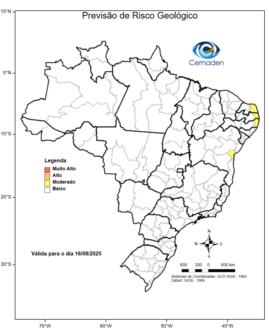 Neste sábado (16/08/2025), o cenário de risco de eventos geo-hidrológicos para as regiões do Brasil é apresentado a seguir: