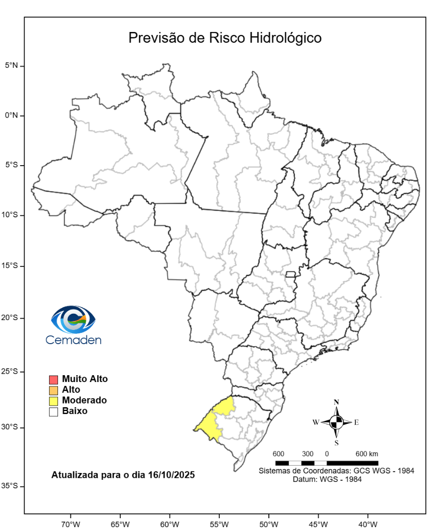 Figura 1 - Possibilidade de ocorrência de eventos hidrológicos em ao menos um município das Regiões Geográficas Intermediárias indicadas. Este mapa é elaborado por uma equipe multidisciplinar, levando em consideração os cenários de riscos hidrológicos atuais somados à previsão de chuva.