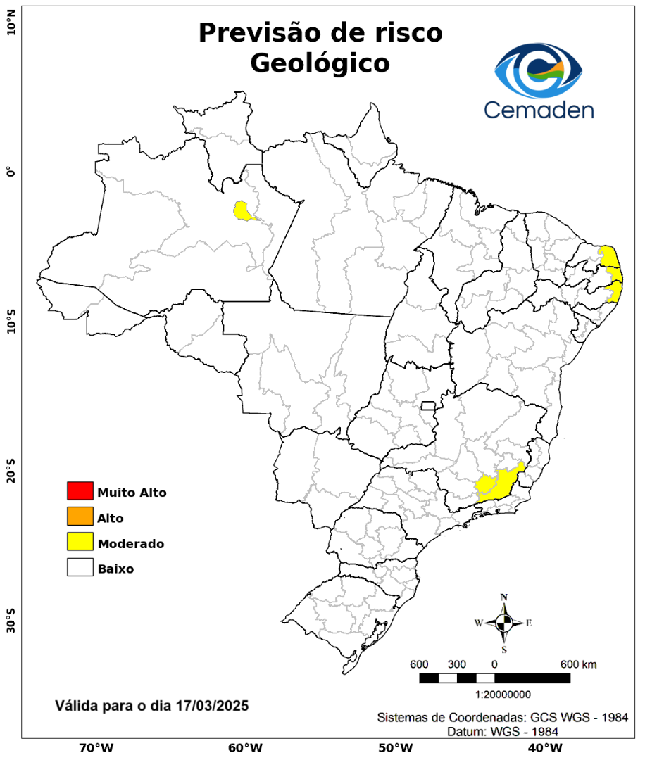 Nesta segunda-feira (17/03/2025), o cenário de risco de eventos geo-hidrológicos para as regiões do Brasil é apresentado a seguir:
