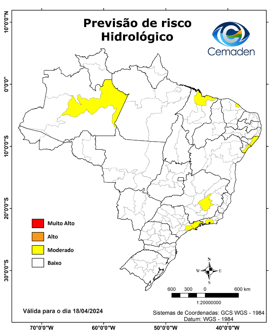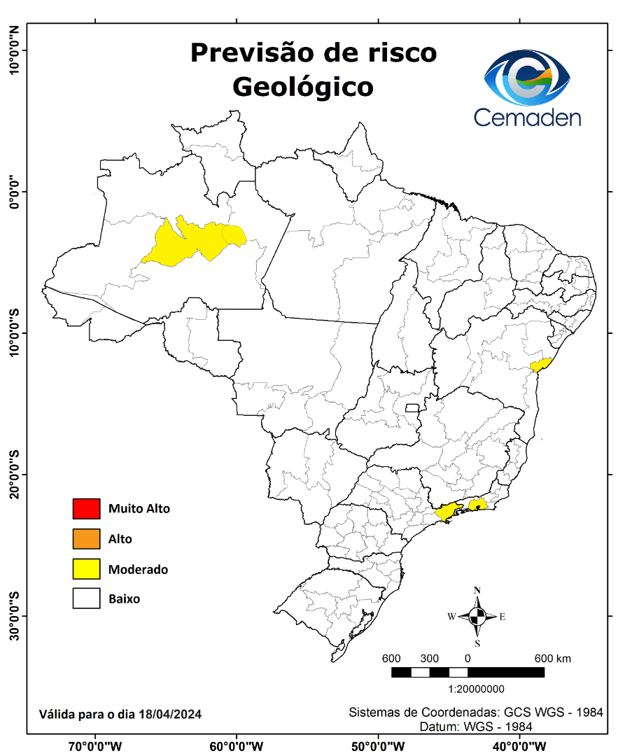 Nesta quinta-feira (18/04/2024), o cenário de risco de eventos geo-hidrológicos para as mesorregiões do Brasil é apresentado a seguir: