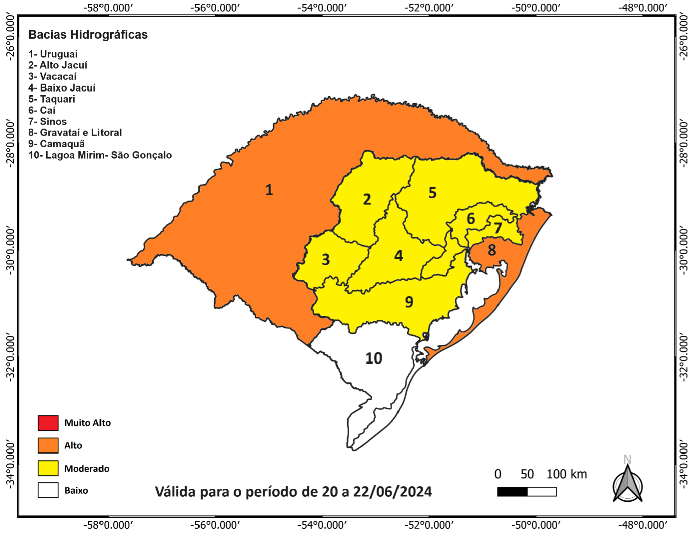 Considera-se ALTO o cenário de risco hidrológico para as bacias do Uruguai, Gravataí e Litoral (em laranja, na Figura 3). Na porção alta da bacia do rio Uruguai, há previsão de altos acumulados, podendo ocasionar inundações nos municípios da região do Noroeste Rio-Grandense. Na bacia do rio Gravataí, há possibilidade de ocorrência de inundações e alagamentos urbanos, com destaque para a região metropolitana de Porto Alegre em função dos altos acumulados observados, somados à previsão dos próximos dias.