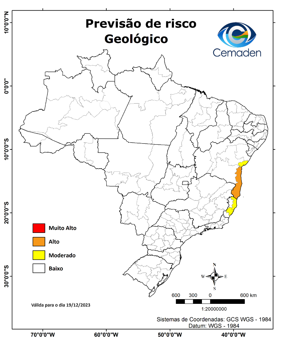 Nesta terça-feira (19/12/2023), o cenário de risco de eventos geo-hidrológicos para as mesorregiões do Brasil é apresentado a seguir: