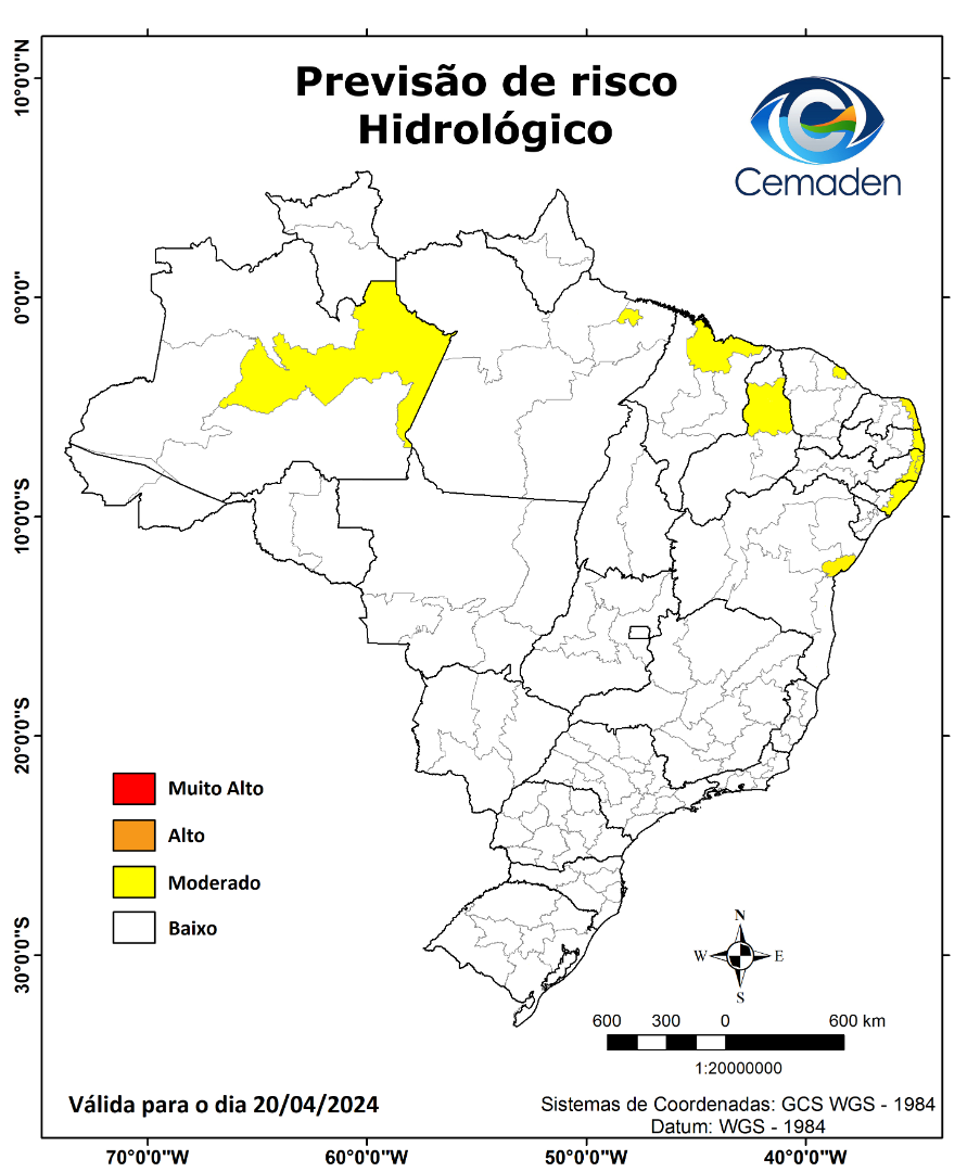 Neste sábado (20/04/2024), o cenário de risco de eventos geo-hidrológicos para as mesorregiões do Brasil é apresentado a seguir: