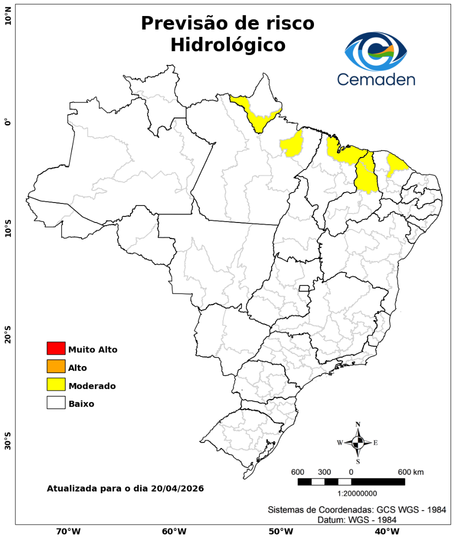 Nesta segunda-feira (20/04/2026), o cenário de risco de eventos geo-hidrológicos para as regiões do Brasil é apresentado a seguir: