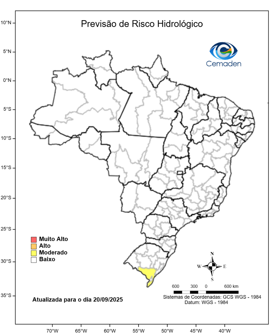 Figura 1 - Possibilidade de ocorrência de eventos hidrológicos em ao menos um município das Regiões Geográficas Intermediárias indicadas. Este mapa é elaborado por uma equipe multidisciplinar, levando em consideração os cenários de riscos hidrológicos atuais somados à previsão de chuva.