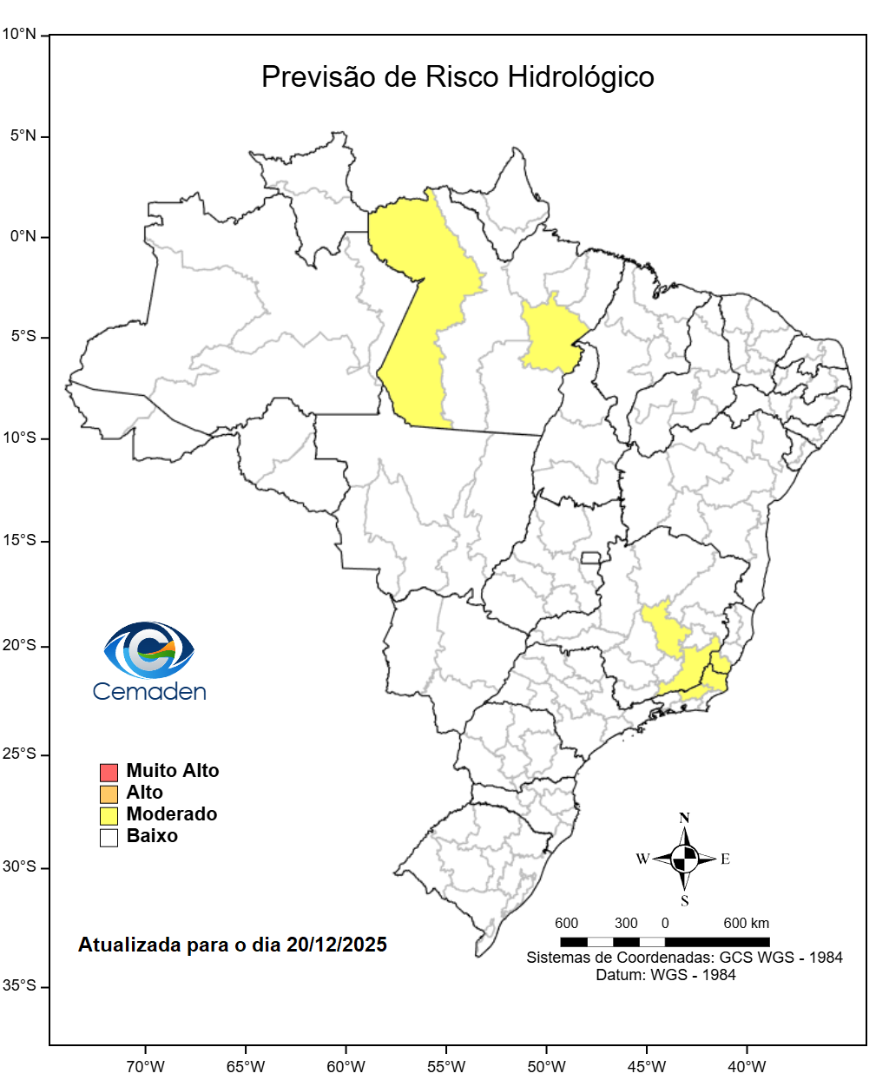 Neste sábado (20/12/2025), o cenário de risco de eventos geo-hidrológicos para as regiões do Brasil é apresentado a seguir: