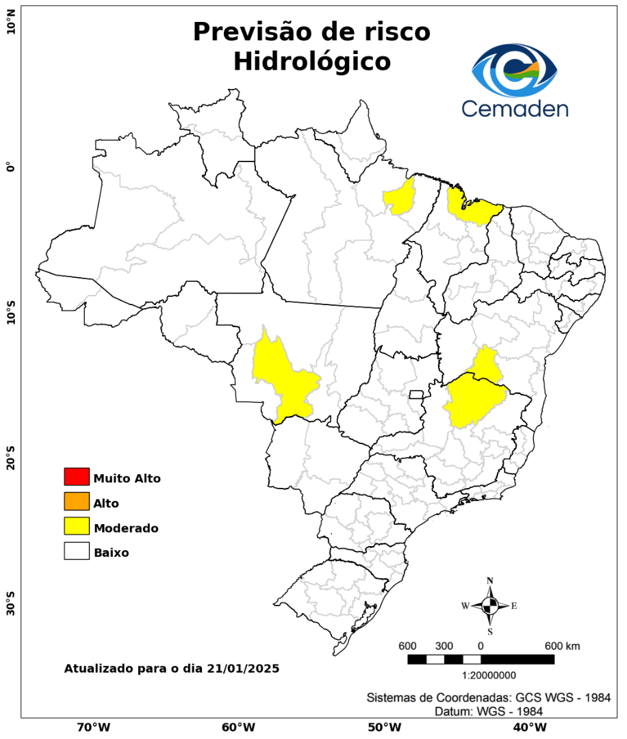 Nesta terça-feira (21/01/2025), o cenário de risco de eventos geo-hidrológicos para as regiões do Brasil é apresentado a seguir: