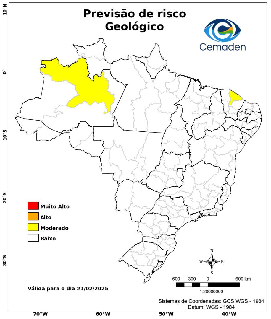 Nesta sexta-feira (21/02/2025), o cenário de risco de eventos geo-hidrológicos para as regiões do Brasil é apresentado a seguir:
